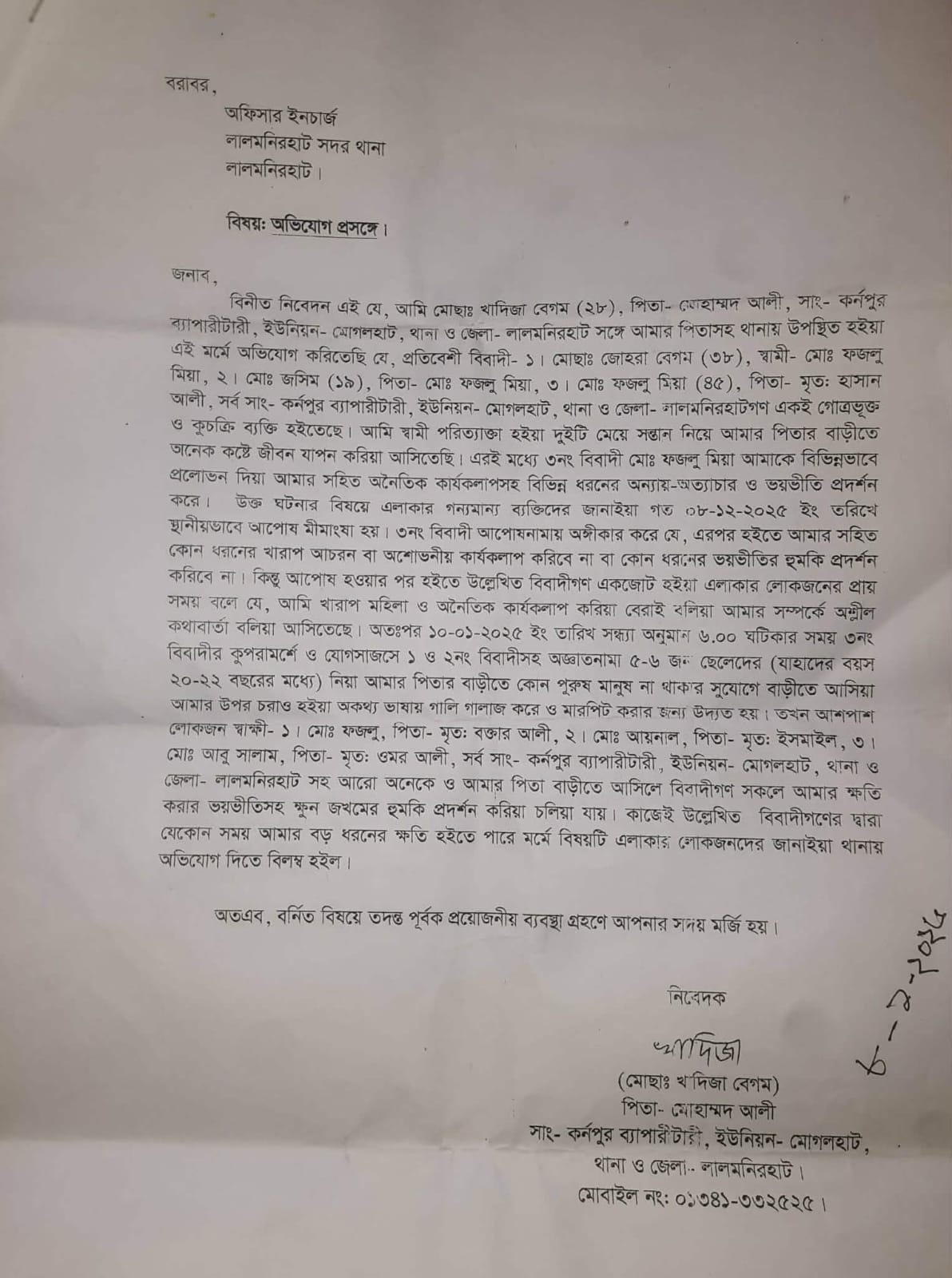 অভিযোগ সূত্রে জানা গেছে, খাদিজা বেগম একজন স্বামী পরিত্যক্তা নারী। তিনি দুই কন্যা সন্তানকে নিয়ে তার বাবার বাড়িতে অনেক কষ্টে জীবন যাপন করে আসছে। এরইমধ্যে একই ইউনিয়নের কর্নপুর ব্যাপারীটারী গ্রামের মৃত: হাসান আলীর ছেলে ফজলু মিয়া তাকে বিভিন্ন রকম প্রলোভন দেখিয়ে তার সাথে অনৈতিক কার্যকলাপ সহ বিভিন্ন ধরনের অন্যায় - অত্যাচার ও ভয়ভীতি প্রদর্শন করেন।